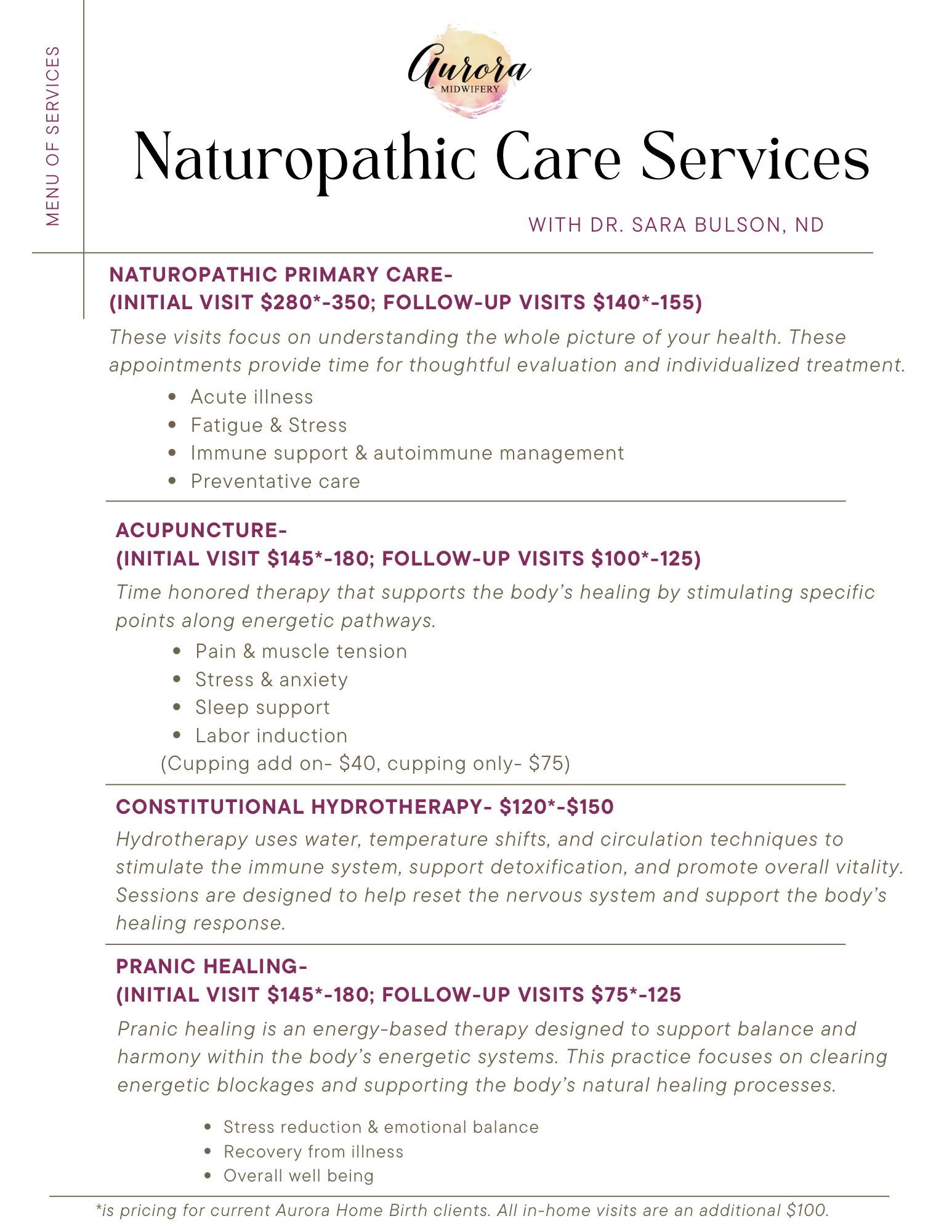✨ Current and former Aurora Midwifery clients receive a discounted initial visit with Dr. Bulson.